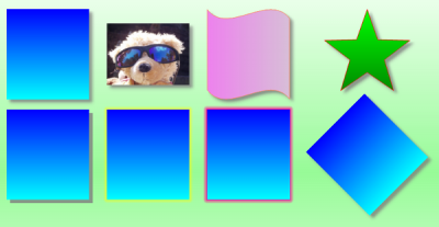Der jeweilige Hintergrund und die meisten Felder können nicht nur vielfältige Farbverläufe, auch zu Transparent, besitzen, sondern durch den eingebauten Füllmustergenerator sind unzählige Muster z.B. "Blumen", "Sterne", Vichymuster und Tartan ("Schottenmuster") möglich. (Hier einige Beispiele!) Alle Füllmuster stehen auch für die Füllung von Schriftzeichen zur Verfügung.