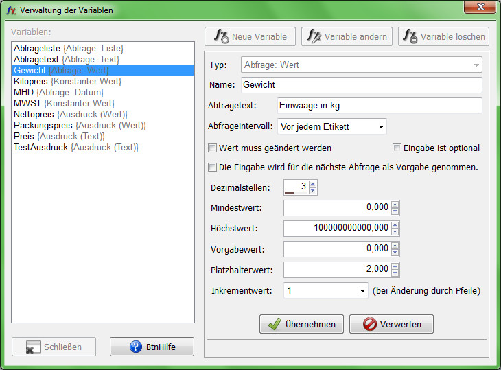 Für jede Tüte bzw. Etikett das Layout zu ändern wäre viel zu viel Aufwand. Hier kommen nun die Variablen ins Spiel. Der Verkaufspreis ist die Einwaage mal Kilopreis. Dafür gibt es den Variablentyp Ausdruck (Wert). Mit diesem können normale mathematische Ausdrücke berechnet werden. Der Zugriff auf eine Variable erfolgt über den Namen der Variablen dem ein "$" vorangestellt ist, also: $Gewicht * $Kilopreis. Die Variable Kilopreis ist eine Variable mit einem konstanten Wert, da sich der Kilopreis nicht laufend ändert. Man könnte diesen natürlich auch direkt in dem Ausdruck angeben, aber der Kilopreis soll ebenfalls auf dem Etikett stehen. Bei einer Preisänderung müsste man also an mindesten zwei Stellen der Kilopreis geändert werden. Da ist es einfacher wenn dieser nur an einer Stelle bei der Variablen Kilopreis geändert wird.