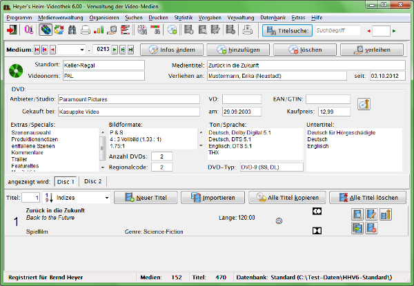 In der Medienverwaltung kann gezielt der Inhalt eines Mediums angesehen oder geändert werden. Im Bild oben ist die Ansicht bei einer DVD zu sehen.
