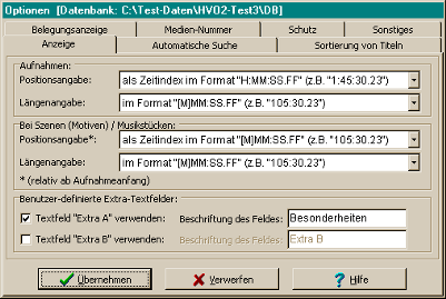 Mit den Optionen können eine Reihe von Einstellungen vorgenommen, die teilweise die Anzeige von bestimmten Informationen wie z.B. die Angabe der Zeitindexe bzw. Timecodes (im Bild oben dargestellt) oder das Format der Medien-Nummer beeinflusst.